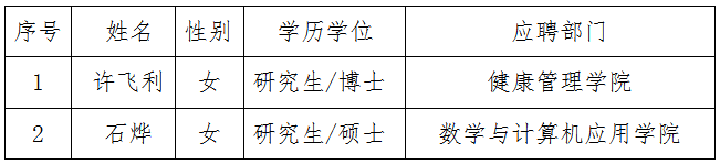 根據(jù)陜西省人社廳《關(guān)于陜西省事業(yè)單位公開招聘人員辦法》規(guī)定及《商洛學(xué)院2020年人才招聘計劃》,經(jīng)過資格審查、試講、專家面試等環(huán)節(jié)考察,并經(jīng)院長辦公會2020年9月17日研究,同意招聘許飛利等2位同志來我校工作,現(xiàn)予以公示。如有異議,請于2020年9月25日前向人事處或紀(jì)委辦公室反映。
