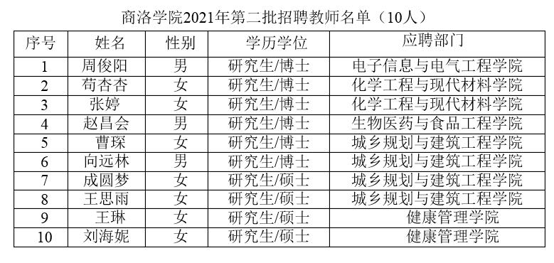附件:商洛學院2021年第二批招聘教師名單