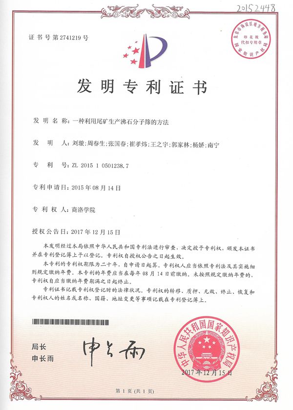 (2)“一種利用尾礦生產沸石分子篩的方法”受讓方:陜西宏科綠色建材有限公司