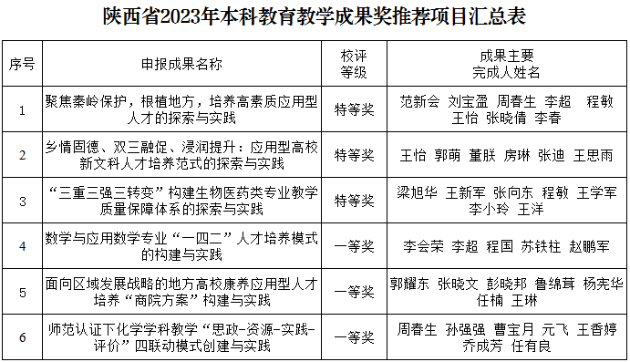 根據《關于開展2023年高等教育教學成果獎評審工作的通知》(陜教函〔2023〕1299號)文件精神,我校認真組織開展高等教育教學成果獎申報工作,經各院(部)推薦,校內外專家評審,學校教學工作委員會審定,擬推薦《聚焦秦嶺保護,根植地方,培養高素質應用型人才的探索與實踐》等6個項目(見下表)申報2023年陜西省高等教育教學成果獎,現予以公示。