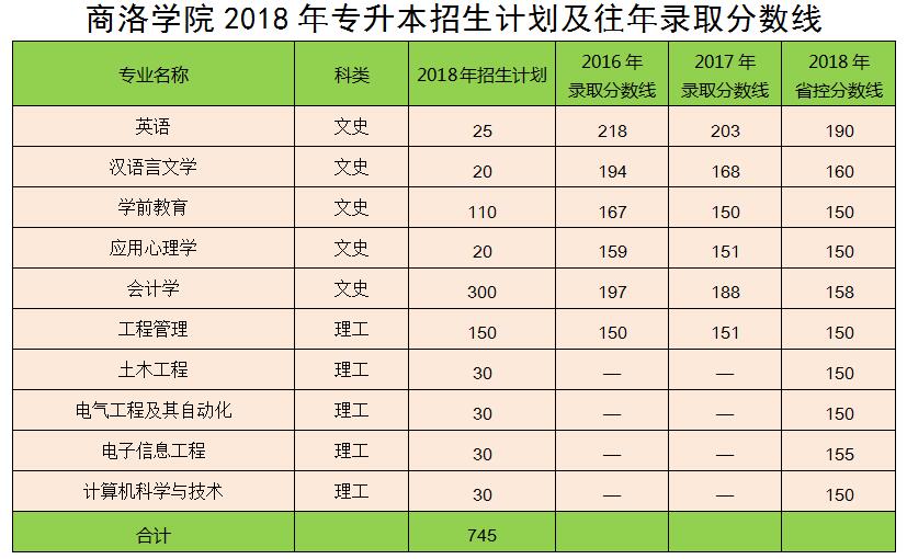 根據陜教〔2018〕93號文件精神,陜西省教育廳下達我校2018年普通高等教育專升本招生計劃745個,共10個招生專業,詳細各專業招生計劃及歷年錄取分數線如下。