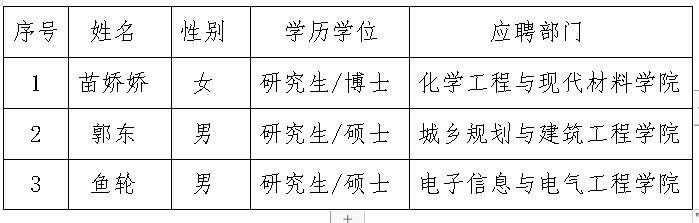 根據《陜西省事業單位公開招聘工作人員實施辦法》(陜人社發〔2017〕51號)規定及《商洛學院2019年人才招聘計劃》,經過資格審查、試講、專家面試等環節考察,并經院長辦公會2019年3月8日研究,同意招聘苗嬌嬌等3位同志來我校工作,現予以公示。如有異議,請于2019年3月15日前向人事處或監察室反映。