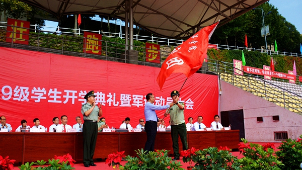 大會(huì)伊始,全體起立,奏唱國(guó)歌,升國(guó)旗。龍治剛為2019級(jí)學(xué)生軍訓(xùn)團(tuán)授團(tuán)旗,范新會(huì)講話,劉勇宣讀了2019級(jí)新生獎(jiǎng)學(xué)金表彰決定,出席大會(huì)的校領(lǐng)導(dǎo)與嘉賓為獲獎(jiǎng)新生頒獎(jiǎng)。