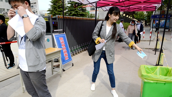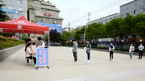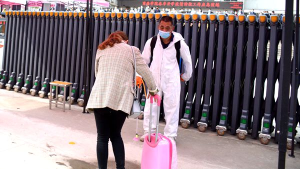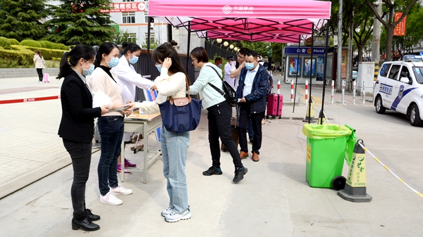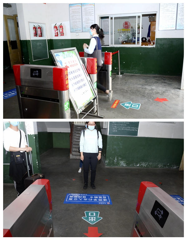 隨著龍治剛“演練開始”一聲令下,緊張有序的演練正式拉開帷幕,幾十余名“學生”在學校大門口外保持1.5米間隔依次進入消毒通道,卸下舊口罩投棄到專用垃圾箱后佩戴工作人員配發的一次性醫用口罩,經工作人員查驗有效證件后進入校門口自動測溫門,進行第一次體溫檢測。體溫檢測正常的學生按照指示線到一號教學樓前的各學院接待點接受二次體溫檢測、掃描驗證健康二維碼、填寫健康承諾書。