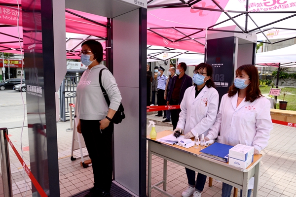 “嘀嘀嘀”,測溫門報警聲突然響起,發現一名學生體溫異常。測溫工作人員立即擋停當事學生原地等待,要求后面學生退后改道通行,臨時封閉該通道并立即報告現場值班醫護人員。醫務人員趕赴現場對學生進行防護指導,引導異常學生到距離最近的臨時隔離點,對學生進行手部消毒、核實體溫、詢問流行病學史并做好記錄,消毒人員對該生通過的路線及臨時隔離點進行終末消毒……