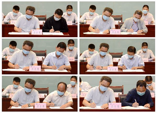 黨委書記龍治剛與職能部門、教學(xué)院(部)負(fù)責(zé)人代表分別簽訂了2020年度《全面從嚴(yán)治黨責(zé)任書》《意識形態(tài)工作責(zé)任書》和《穩(wěn)定安全工作責(zé)任書》。黨委副書記、校長范新會主持會議,黨委副書記彭虎軍宣讀表彰文件。