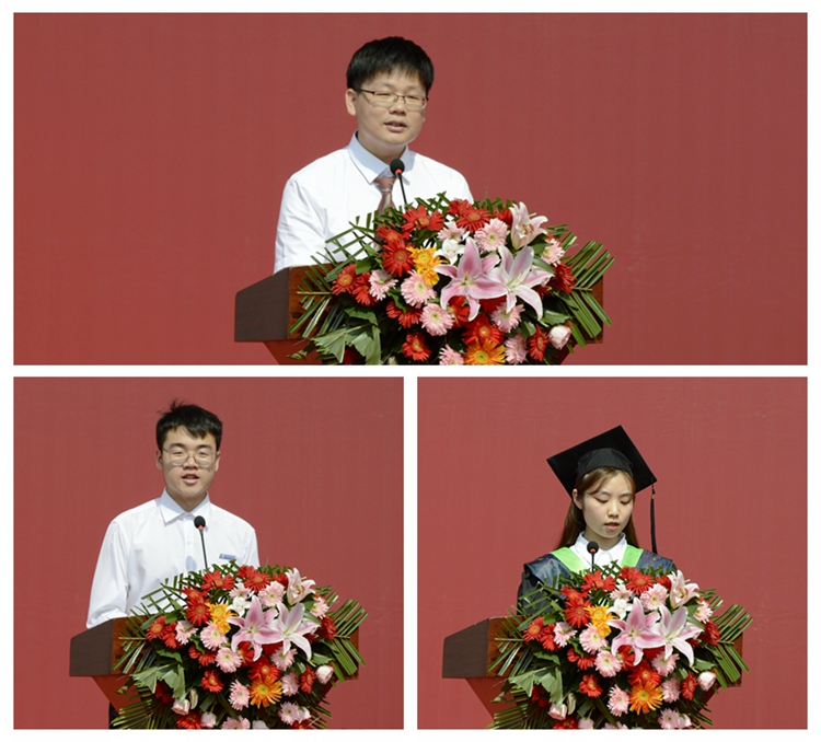 教師代表、建工學院秦進博士,在校學生代表、人文學院陶亮分別作了發言,為畢業生們送去了美好祝福。畢業生代表劉昕怡代表全體畢業生感謝母校的培育之恩,表示將踐行“博聞強志正道直行”校訓,更加勤奮、更加拼搏,以優異的成績為母校爭光。