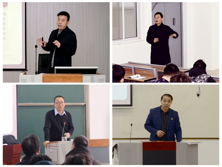 (左到右依次為黨委副書記彭虎軍、劉勇,副校長劉寶盈、王新軍宣講)