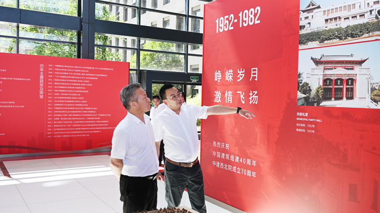 會前,張志昌、范新會、郭瑾一行在中國建筑西北設(shè)計(jì)研究院有限公司相關(guān)負(fù)責(zé)人的陪同下參觀了70周年展廳和綠色能源院。