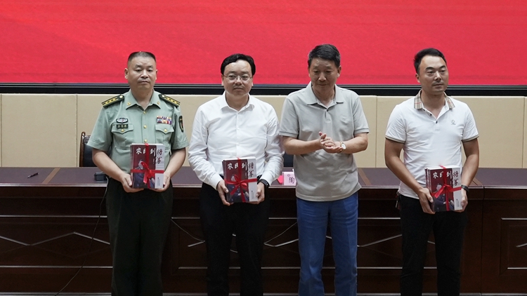 在捐贈儀式上,陶正明將軍向我校圖書館、商洛軍分區及各縣人武部、全市教育系統中小學校圖書館和商洛市圖書館贈送1000冊《農民到將軍》圖書。我校圖書館館長張國春代表學校接受贈書并為陶正明將軍頒發收藏證明。高運鋒、楊占水和劉輝分別代表商洛軍分區、商洛市教育系統和市圖書館接受贈書。
