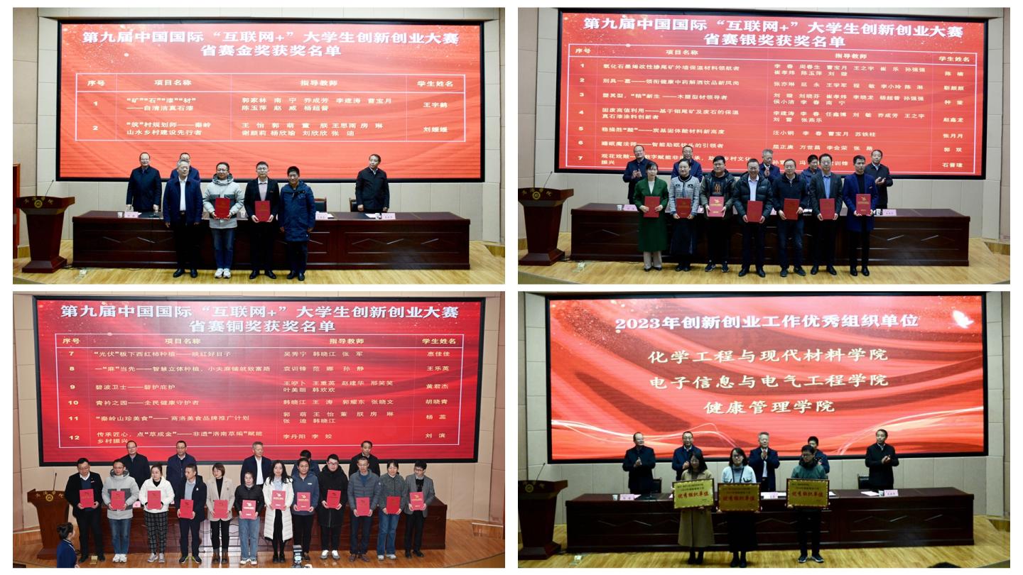 本次大會分為兩個階段,第一階段總結表彰我校榮獲2023年創新創業工作優秀組織單位、優秀指導教師、第九屆中國國際“互聯網+”大學生創新創業大賽省賽金獎、銀獎、銅獎團隊,并為第二屆“商洛學院創新創業學院”校級導師頒發了聘書。優秀組織單位代表電子信息與電氣工程學院院長袁訓鋒、優秀指導教師代表王思雨、獲獎學生代表建工學院城鄉規劃專業房志明、化材學院資源循環與利用專業王宇鶴分別作了交流發言。