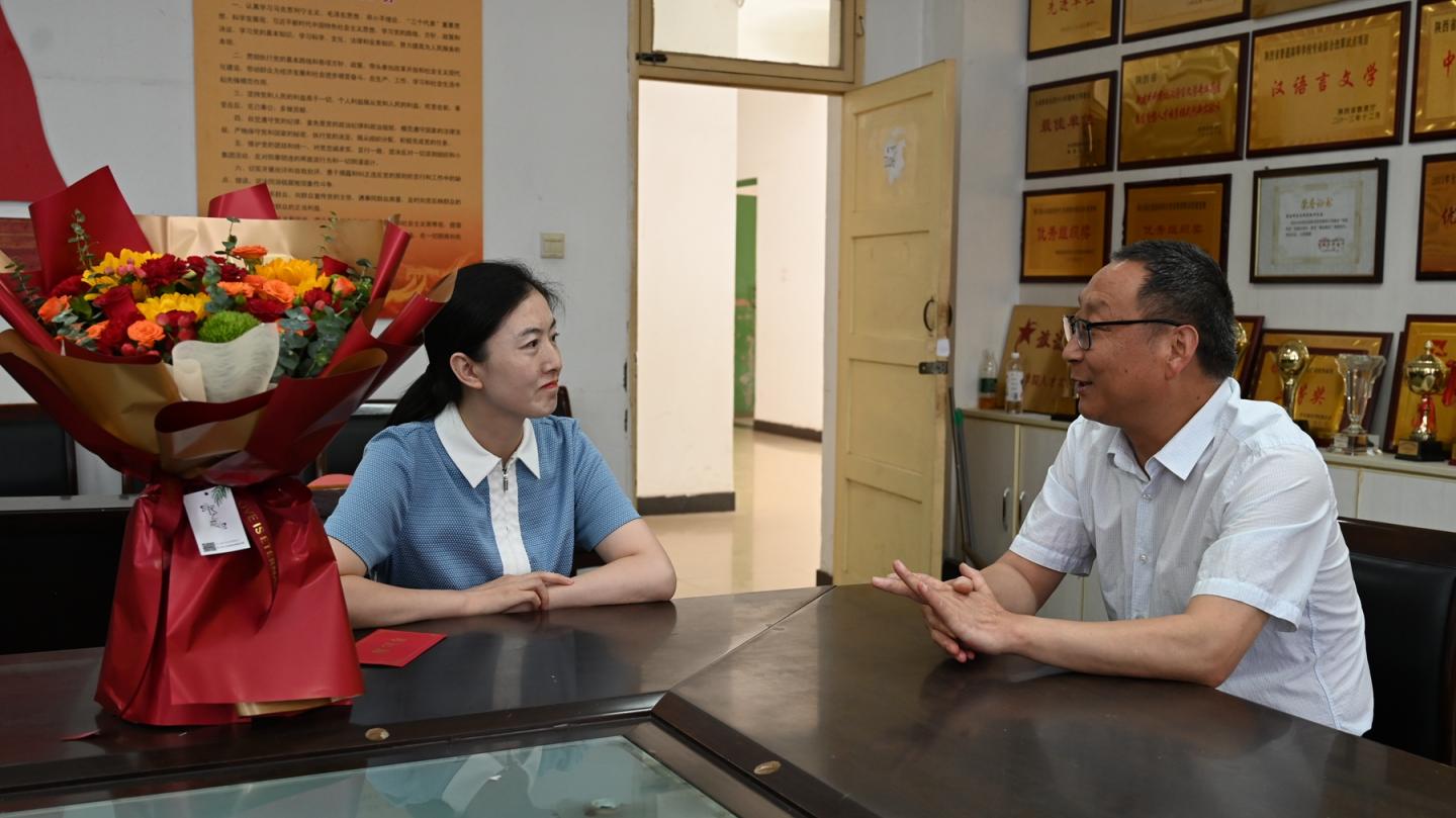 副校長劉寶盈前往人文學院,慰問2023年陜西省思政大練兵課程思政教學標兵、2024年陜西省第六屆青年教師教學技能競賽二等獎獲得者劉玉婷老師,鼓勵她全面總結比賽經驗,力爭在未來的教學和科研工作中取得更加優異的成績。