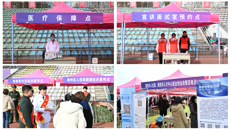 商洛軍分區副司令員陸樂樂、商州區人武部上校政委高運鋒、商洛市人社局四級調研員張利民、商洛市就業管理局副局長李榮軍、商洛職業技術學院學生處處長張靜、商洛市人才中心副主任董毅、西安市職介中心公共就業服務部副部長鄧方園等參加了招聘會有關活動。