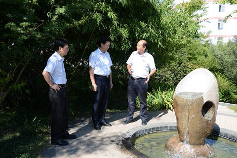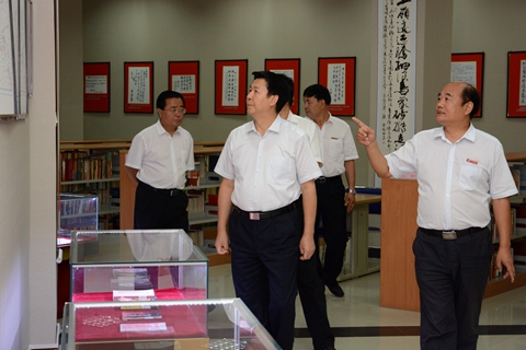 在校領導劉建林、王思懷、魏書堂、彭虎軍、劉寶盈的陪同下,莊長興一行視察了我校校園環境和特色展室。