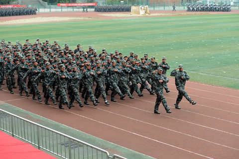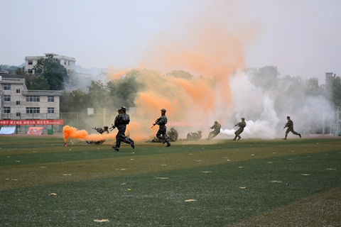分列式結束后,我校學生進行了隊列隊形、軍體拳和反恐戰術匯報表演。伴隨著悠揚的旋律,女兵用花束排出了巨大的“1976”“2016”等字樣,慶祝我校建校40周年。同學們還擺出了“商院夢 中國夢”“不忘初心 繼續前進”等造型,表達我校學生秉承校訓,刻苦學習,報效祖國的堅定信念。由男兵表演的軍體拳動作精煉、節奏分明、套路連貫、氣勢磅礴、喊殺聲震天,贏得了現場陣陣熱烈的掌聲。反恐戰術演練展示了戰術基本持槍動作、戰術手語、反恐戰術隊形和特種偵察部隊破襲戰斗。破襲戰斗通過在操場搭建臨時建筑物,模擬敵通信樞紐,特種偵察分隊對其進行破襲,同學們配合密切,組織嚴謹,展示了良好的戰斗技能和戰術素養,將現場氣氛推向了高潮。