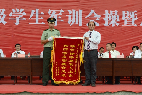 為感謝軍訓團教官對我校學生的悉心指導,黨委書記、校長劉建林代表學校向47集團軍某部贈送了寫有“鐵骨錚錚顯軍人本色 亦師亦友彰教官風采”的錦旗,馬防少校代表全體教官接受了錦旗。