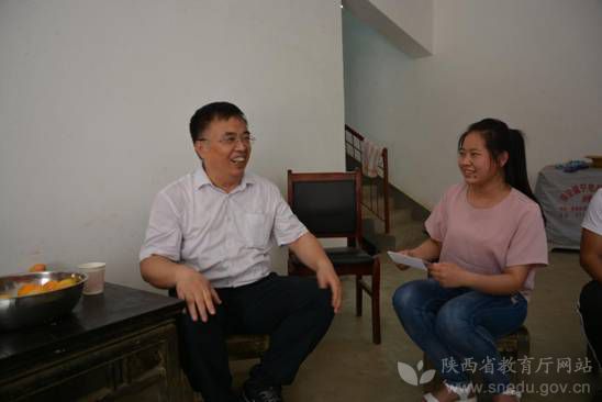 陜西省政府學位委員會秘書長袁寧與建檔立卡貧困戶學生張永慧交談并送上慰問金