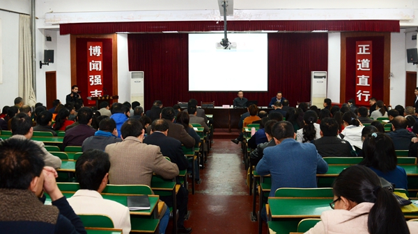 10月18日至24日,黨的十九大在北京勝利召開。我校及時召開黨委理論學習中心組集體理論學習擴大會,專題學習黨的十九大精神,研究部署我校學習宣傳貫徹黨的十九大精神相關工作。十九大代表、商洛市委書記陳俊來到我校,深入師生宣講黨的十九大精神;中國人民大學博士生導師,中國思想政治工作研究會、中宣部思想政治工作研究所特約研究員張云飛教授應邀來我校作專題報告。為了使師生深入學習領會黨的十九大精神,我校及時成立了以馬克思主義學院教師為主體,由校紀委書記王思懷教授任團長的黨的十九大精神宣講團。宣講團成立后,在一周時間內通過宣講報告、形勢與政策課等形式集中發力,實現了全校師生全覆蓋。