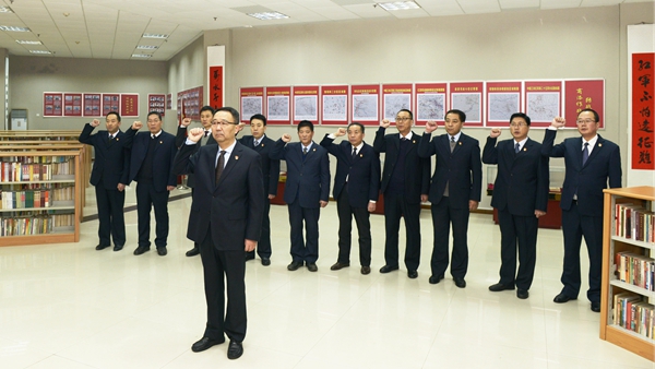 1月15日上午8時,中國共產黨商洛學院第二屆委員會委員龍治剛、范新會、王思懷、彭虎軍、劉寶盈、劉勇、王新軍、李超、楊存典、張向東、郭瑾,一起來到位于學校圖書館的商洛紅色文化資料館展廳,集體重溫入黨誓詞。在黨委書記龍治剛領誓下,黨委委員們舉起右拳,面對黨旗莊嚴宣誓。