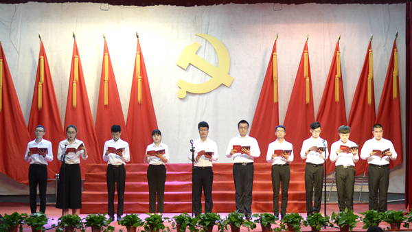 教職工黨員代表集體誦讀了《梁家河》中的《修身》,學生黨員代表集體誦讀了《走進新時代》篇章。