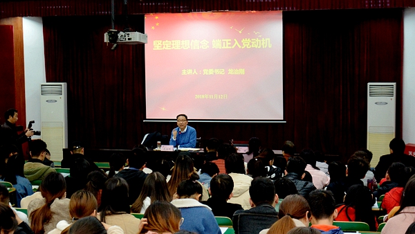 黨委書記龍治剛以《堅定理想信念 端正入黨動機》為題,為培訓學員作了專題報告。報告中,他帶領學員們在浩瀚的歷史長河中,剖析崇高的理想信念對一個國家、一個民族興衰存亡的重要作用,又以深刻的哲學思辨結合當前社會實際,為學員們解析了實現理想信念的最佳路徑。他指出,對生命價值的無限追求和解決現實生活中的問題是我們實現理想信念的“彼岸”和“此岸”,實現理想信念既要樹立共產主義遠大理想,還要遵循理想信念建設的一般規律。他強調,要把個人的理想信念與社會的理想信念統一起來,把理想信念植根于靈魂深處, 保持蓬勃朝氣、昂揚銳氣、浩然正氣,腳踏實地不斷學習,提高自己的綜合素質,為實現個人的理想而不懈奮斗。大事難事看擔當,逆境順境看胸襟,是喜是怒看涵養,有舍有得看智慧,是成是敗看堅持。他還寄語發展對象“八個堅持”,即:堅守理想,你就會有人生的航向;堅持學習,你就會進步;堅持勤奮,你就會成功;堅持創造,你就會有發展;堅持擔當,你就會有信任;堅持奉獻,你就會有快樂;堅持敬畏,你就會有安全;堅持感恩,你就會有幸福。