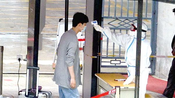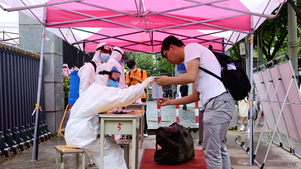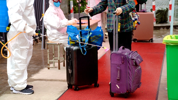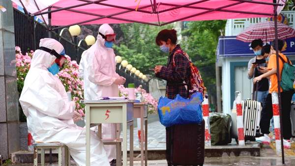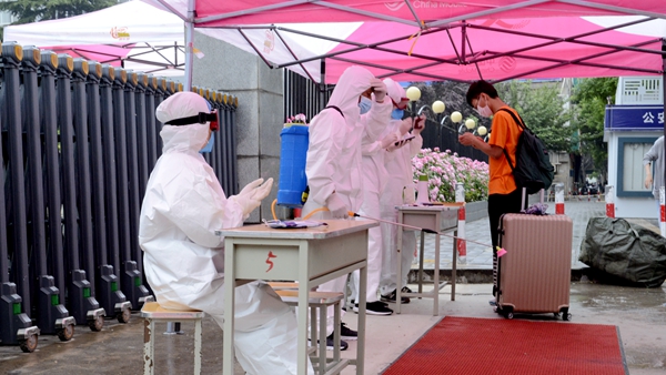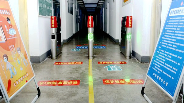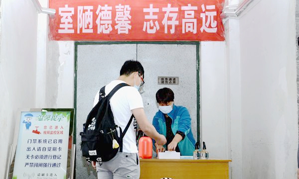 校門口,工作人員引導報到學生有序通過測溫通道、消殺區、身份核驗區、掃碼報到區、院系學生報到處,對學生行李就地進行全面消毒、更換口罩、測量體溫、核驗健康綠碼和身份證明、簽訂返校承諾書,依次完成開學報到各個項目步驟后,學生在輔導員、聯絡教師的陪同下,保持安全距離,前往各自所在的公寓樓,經公寓管理人員測溫、手部消毒、信息登記后,領取出入證進入宿舍。