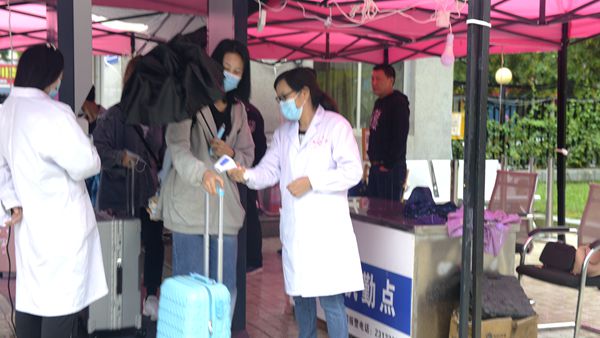 學校高度重視此次演練,制定了詳細的演練方案,模擬設置了學生報到、餐廳就餐、應急情況處理等多個場景,對新生報到流程進行了全景模擬。演練自校門外開始,參演學生佩戴口罩、攜帶行李,以1米以上間隔依次進行更換口罩、測量體溫、信息識別登記、物品消殺等程序后,通過測溫門進入校門,按照報到流程,在新生登記處進行登記。門崗處還設置了臨時留觀點,為體溫異常的報到新生做進一步檢測處理。餐廳實行錯峰、分餐制,演練學生佩戴口罩在餐廳入口處洗手、測溫、消毒后有序進入餐廳,間隔1米以上距離排隊點餐、取餐,保持距離、單向就座,就餐結束后,有序從指定出口排隊離開。