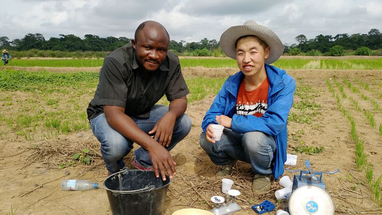 張軍(右)在喀麥隆深入田間開展農業技術示范推廣