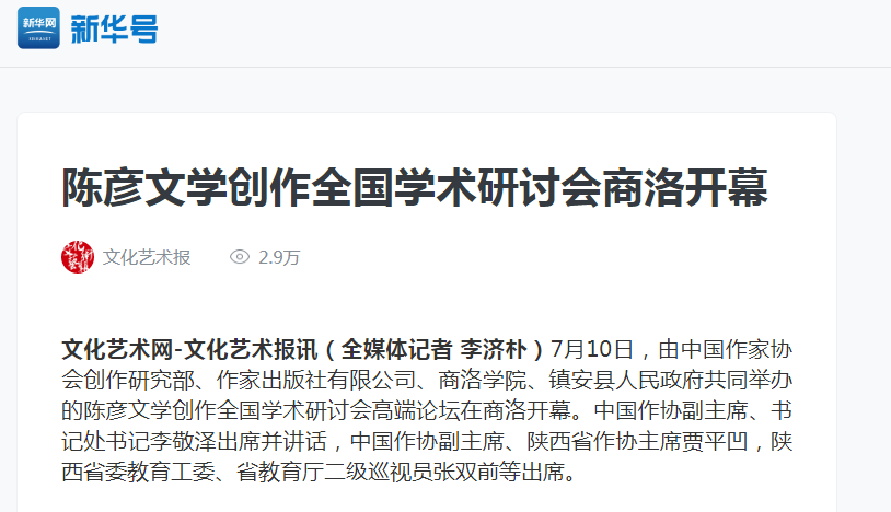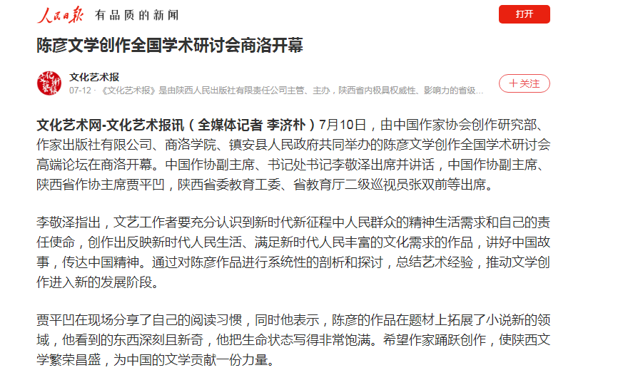 7月10日,由我校與中國作家協(xié)會創(chuàng)作研究部、作家出版社有限公司、鎮(zhèn)安縣人民政府聯(lián)合舉辦的陳彥文學創(chuàng)作全國學術研討會高端論壇在我校舉行。賈平凹、陳彥兩位著名商洛籍作家、茅盾文學獎獲得者及50余位國內文學界專家、學者齊聚我校開展研討交流。人民號、新華號、學習強國、華商網、搜狐網、新浪網、中華網、騰訊網、今日頭條、西部網、中國作家網、西安晚報、文化藝術報、陜西作家網、西安新聞網、商洛新聞網等中央、省、市媒體對我校陳彥文學創(chuàng)作全國學術研討會高端論壇紛紛進行了報道。各類微信、微博等自媒體也紛紛報道和轉發(fā),使讀者進一步了解了陳彥的文學世界,陳彥的文學藝術也將在更廣闊的空間傳播,積極促進了商洛乃至陜西文學事業(yè)的繁榮發(fā)展,擴大了我校的知名度和影響力。