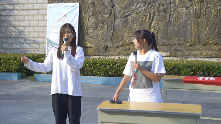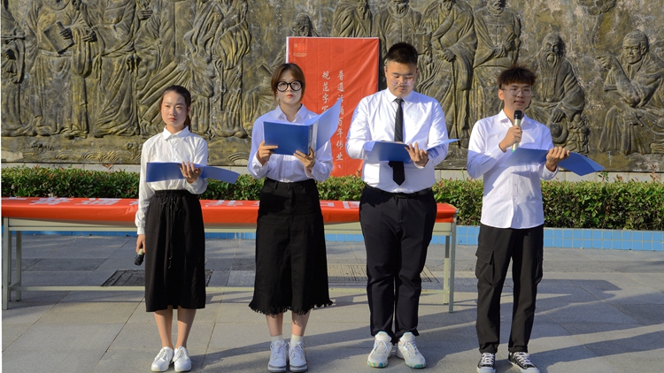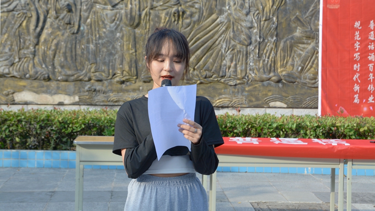 人文學(xué)院學(xué)生代表王瀅在表態(tài)發(fā)言中呼吁全體學(xué)生要規(guī)范使用普通話,讓規(guī)范語言之花開遍美麗的校園。學(xué)生朱怡寧、丁欣玉為大家表演了相聲《普通話》,通過生動有趣的表演向展示了不良語言習(xí)慣及普通話的別樣韻味,切實增強了大家的語言規(guī)范意識。王林等學(xué)生向大家朗誦了紅色詩歌《永遠(yuǎn)跟黨走》,帶領(lǐng)大家重溫了先輩們浴血奮戰(zhàn)的革命歲月,讓大家在詩歌中感悟黨的崢嶸歲月,體會語言的動人魅力。