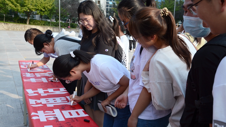 現(xiàn)場師生在推廣橫幅上進(jìn)行簽字,表達(dá)了學(xué)習(xí)國家通用語言文字的決心。