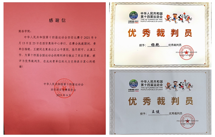 全民全運,同心同行。十四運期間,我校體育教學研究部王健、楊艷、何佳佳、桑國鵬4位教師通過嚴格選拔及考核,分別被選派擔任本屆全運會田徑、羽毛球和跆拳道三個比賽項目的技術官員,并圓滿完成各項工作,充分展示了商洛學院體育教師良好的精神風貌。