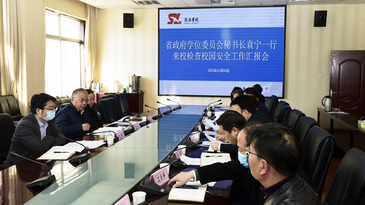 根據陜西省委教育工委、省教育廳校園安全專項整頓工作安排,11月10日上午,陜西省政府學位委員會秘書長袁寧,省教育廳研究生處處長張和平、干部成鵬一行3人來到我校,開展校園安全專項檢查工作。校長范新會主持召開工作匯報會。黨委副書記彭虎軍、副校長王新軍出席匯報會并陪同檢查。黨委辦公室·院長辦公室、宣傳部、人事處、學生處、教務處、保衛處、資產管理處、后勤保障處、信息化建設與管理處相關負責人參加會議。