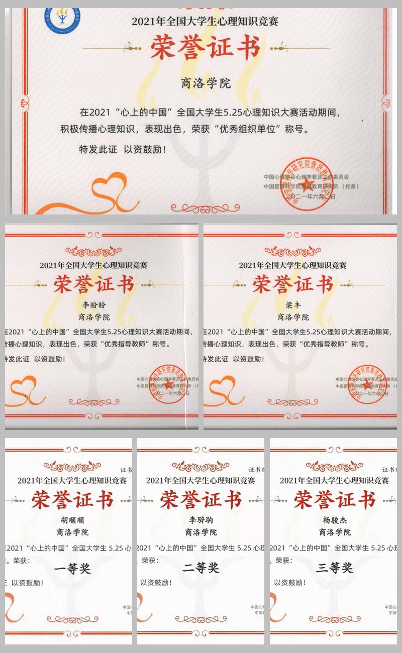 近日,2021“心上的中國”全國大學生5·25心理知識大賽活動圓滿落幕,我校健康管理學院心理學專業學生參加比賽,并獲得一等獎13項,二等獎3項,三等獎4項,學校榮獲“優秀組織單位”,健康管理學院教師梁豐、李盼盼獲得“優秀指導教師”。