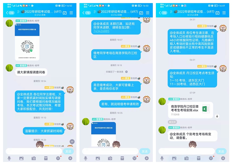 勇擔責任,精心組織考務工作。由于疫情影響,部分原考點在中高風險地區的考生無法前往考試,省教育考試院陸續安排我校借考考生從124人增加到778人,給考務工作帶來極大壓力。學校勇擔責任,科學制定考務工作、疫情防控、后勤保障等各項預案。積極聯系地方政府和公安機關,由商州區公安分局開通綠色通道,安排公安人員與校內安保、考務人員全程押運,連續兩天前往試題印制及中轉地點領取借考考生試卷。最后一批試卷于25日凌晨4:30領回,十余名考務人員通宵等待、連夜分揀,確保第一場考試按時順利開考。負責借考考生咨詢QQ群的工作人員隨時關注政策變化,24小時在線為考生解惑答疑。一位借考考生表示,多虧學校工作做得細致,我們才能及時了解考試安排,懸著的心也放了下來。