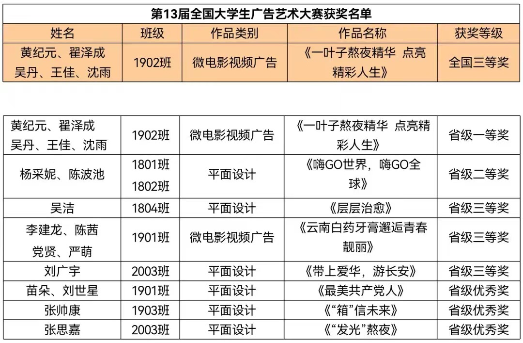 本屆大賽開辟了微電影廣告視頻類新賽道,由藝術學院教師楊靜指導的微電影廣告視頻類作品《一葉子熬夜精華點亮精彩人生》獲得國家級三等獎和省級一等獎、《云南白藥牙膏邂逅青春靚麗》獲得省級三等獎;在平面設計類賽道中,藝術學院教師王曦茜指導的《嗨GO世界,嗨GO全球》獲得省級二等獎,教師王子瑋指導的《層層治愈》榮獲省級三等獎,教師楊靜指導的《帶上愛華游長安》榮獲省級三等獎、《最美共產黨人》獲得省級優秀獎,教師張中義指導的《“發光”熬夜》、教師余鑫指導的《“箱”信未來》獲得省級優秀獎。