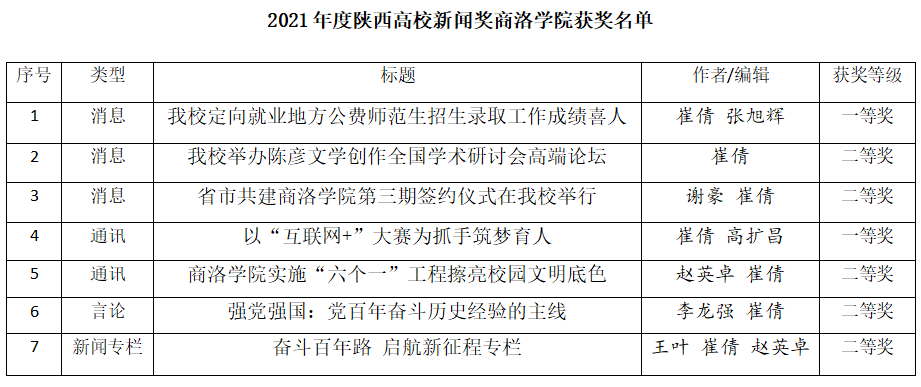 在2021年度陜西高校新聞獎(jiǎng)評(píng)選工作中,我校共送報(bào)各類新聞作品8件,有3件消息類作品、2件通訊類作品、1件言論類和1件新聞專欄類作品獲獎(jiǎng)。其中《我校定向就業(yè)地方公費(fèi)師范生招生錄取工作成績(jī)喜人》獲得消息類一等獎(jiǎng),《以“互聯(lián)網(wǎng)+”大賽為抓手筑夢(mèng)育人》獲得通訊類一等獎(jiǎng)。《我校舉辦陳彥文學(xué)創(chuàng)作全國學(xué)術(shù)研討會(huì)高端論壇》《省市共建商洛學(xué)院第三期簽約儀式在我校舉行》獲得消息類二等獎(jiǎng),《商洛學(xué)院實(shí)施“六個(gè)一”工程擦亮學(xué)校文明底色》獲得通訊類二等獎(jiǎng),《強(qiáng)國強(qiáng)黨:黨百年奮斗歷史經(jīng)驗(yàn)的主線》獲得言論類二等獎(jiǎng),《奮斗百年路啟航新征程專欄》獲得新聞專欄類二等獎(jiǎng)。
