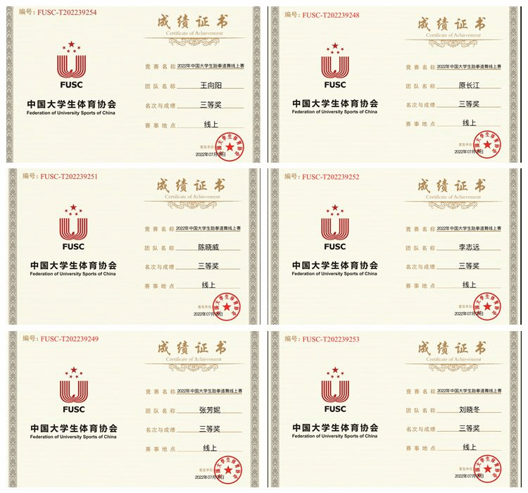 近日,由中國(guó)大學(xué)生體育協(xié)會(huì)主辦,中國(guó)大學(xué)生體育協(xié)會(huì)跆拳道分會(huì)執(zhí)行,中國(guó)地質(zhì)大學(xué)(北京)承辦的2022年中國(guó)大學(xué)生跆拳道舞線上賽圓滿落幕。經(jīng)過與來自廈門大學(xué)、北京交通大學(xué)、中國(guó)地質(zhì)大學(xué)、西安電子科技大學(xué)、成都體育學(xué)院等全國(guó)47所高校,54支代表隊(duì)激烈比拼,我校獲三等獎(jiǎng)。
