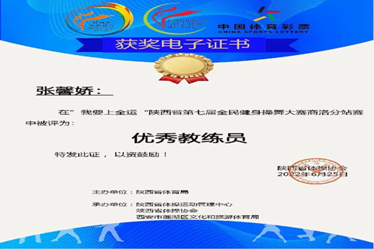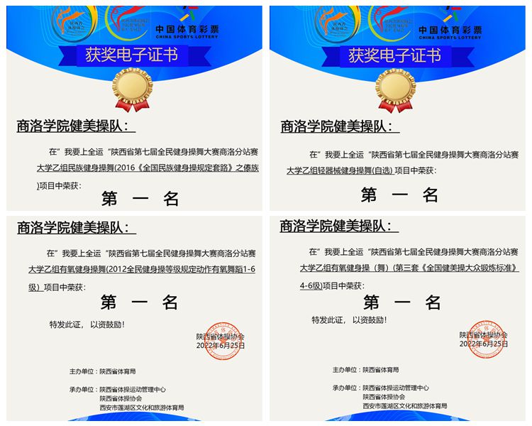 近期,陜西省第七屆全民健身操舞線上比賽圓滿落幕。我校派出由12名學生組建的健美操隊參加比賽,分別獲得大學乙組民族健身操舞(傣族舞)一等獎、輕器械健身操舞(自選)一等獎、有氧舞蹈一等獎及全國健美操大眾鍛煉標準(4-6級)一等獎的優異成績,體育教學研究部教師張馨嬌被評為“優秀教練員”。