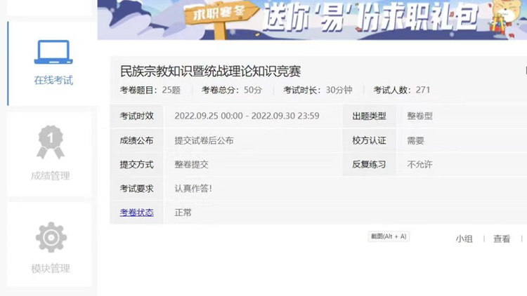 健康管理學院在易班APP上開展了民族宗教知識暨統(tǒng)戰(zhàn)理論知識競賽,全院所有新生均參與答題,進一步提高新生對習近平總書記關于民族團結進步重要論述、民族政策法規(guī)、民族基本常識等內容的掌握。生物學院在易班APP上開展了以“迎華誕,學黨史”為主題的黨史知識競賽,同時在“學習大國”微信公眾號上參與民族宗教知識競賽暨統(tǒng)戰(zhàn)理論知識競賽,全院師生積極參與,答題率高達90%,提高了活動知曉度和普及率。