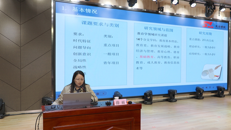 袁訓(xùn)鋒以《教育科研課題的選題與實踐》為題,分別從教育進入高質(zhì)量發(fā)展時代、基礎(chǔ)教育教師與教育科研課題、教育科研課題的選題、教育科研課題的申報與實施四個方面進行了詳細的講解,并就選題以及研究方向的不明確等系列問題提出了相應(yīng)的解決對策。薛雨圍繞課題申報的基本情況、案例材料、相關(guān)說明等方面,詳細介紹了陜西省教育教學(xué)“十四五”規(guī)劃2023年度課題申報流程,并對課題申報相關(guān)要求和注意事項作了重點分析與指導(dǎo)。