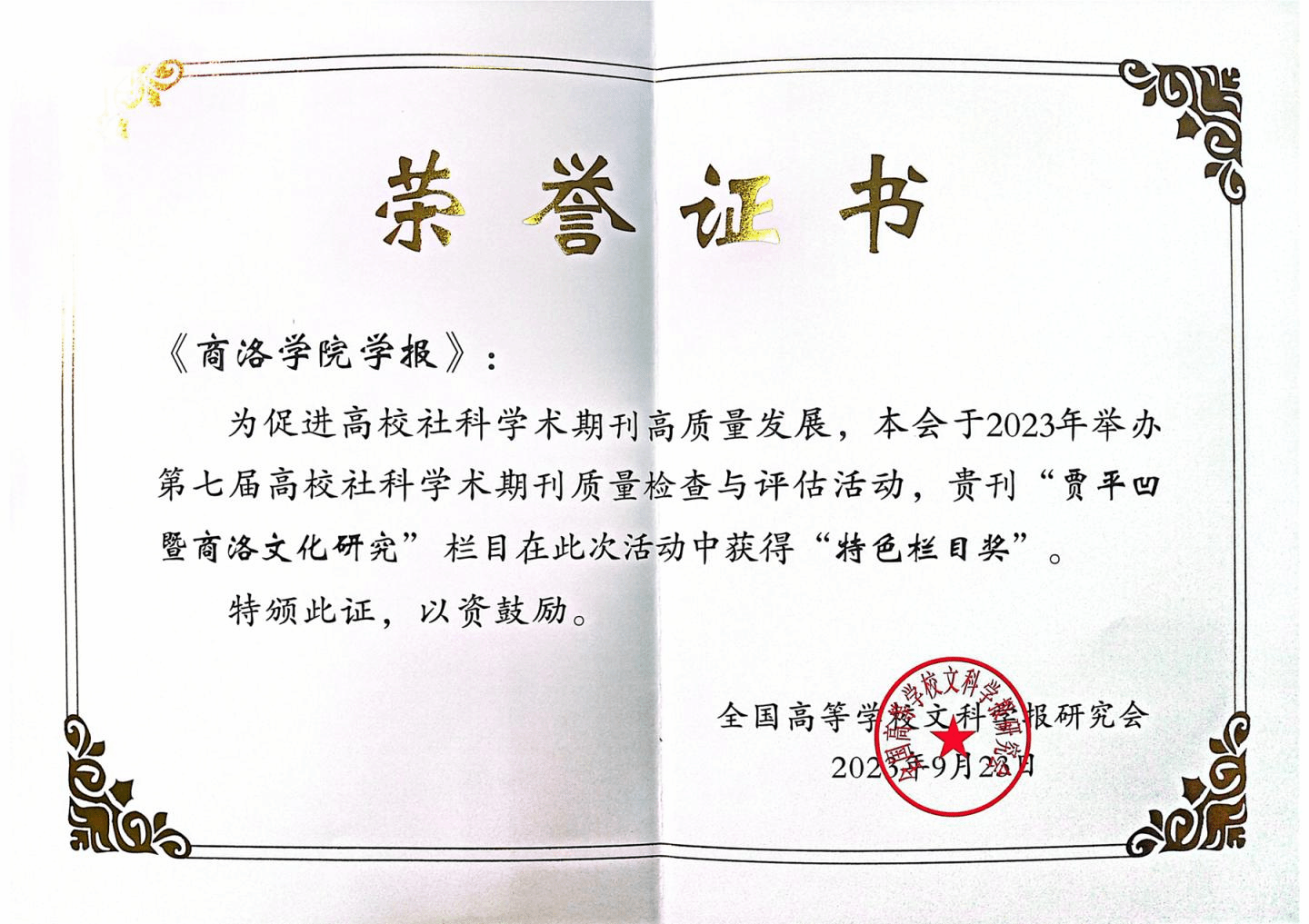 全國高等學校文科學報研究會舉辦的2023年(第七屆)高校社科學術期刊質量檢查與評估活動結果日前公布,我校學報“賈平凹暨商洛文化研究”欄目獲“全國高校社科期刊特色欄目獎”。這是繼“陜西高校精品社科期刊”和“優秀欄目獎”之后,我校學報今年取得的又一佳績。
