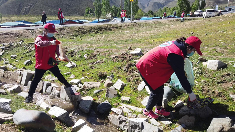 西藏的藍天、碧水、凈土讓人陶醉,但是不和諧的現象隨處可見,塑料袋、衛生紙、食品包裝袋等垃圾被人隨意丟棄在路邊,嚴重傷害了雪域高原的形象,這也是我選擇“環?!弊鳛橹驹富顒又黝}的重要原因,我要用自己的勞動為西藏拂去“綠肺”上的塵埃。