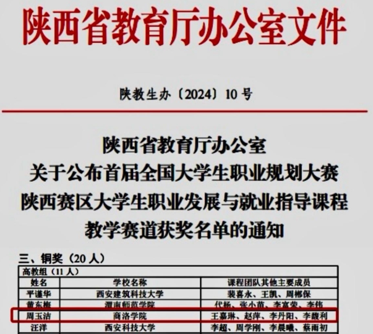 近日,陜西省教育廳公布了首屆全國大學生職業規劃大賽陜西賽區大學生職業發展與就業指導課程教學賽道獲獎名單。我校人文學院輔導員周玉潔及其課程團隊成員獲得銅獎。