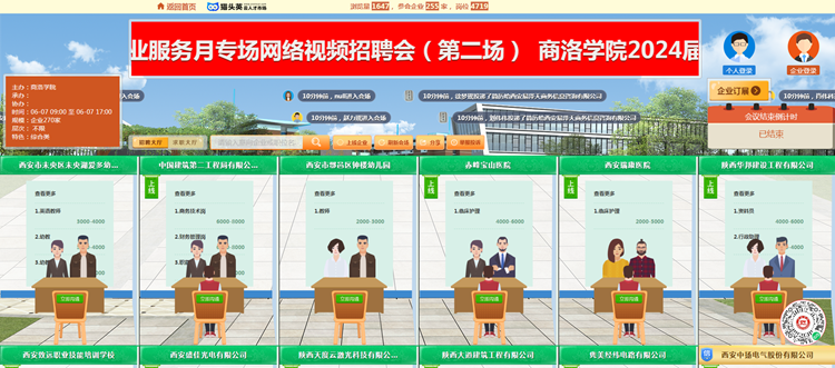 為充分落實2024屆畢業(yè)生就業(yè)“百日沖刺”行動方案,全面促進2024屆畢業(yè)生更加充分、更高質(zhì)量就業(yè),6月7日,我校依托貓頭鷹云就業(yè)平臺舉辦2024屆畢業(yè)生春季綜合類暨民營企業(yè)服務(wù)月專場網(wǎng)絡(luò)視頻招聘會(第二場)。通過搭建“互聯(lián)網(wǎng)+視聘”線上平臺,精準對接畢業(yè)生求職需求,促進畢業(yè)生實現(xiàn)更高質(zhì)量、更加充分就業(yè)。本次招聘會由省教育廳、省就業(yè)留學(xué)中心指導(dǎo),我校和商洛市人社局主辦,我校就業(yè)中心和商洛市人才中心承辦。