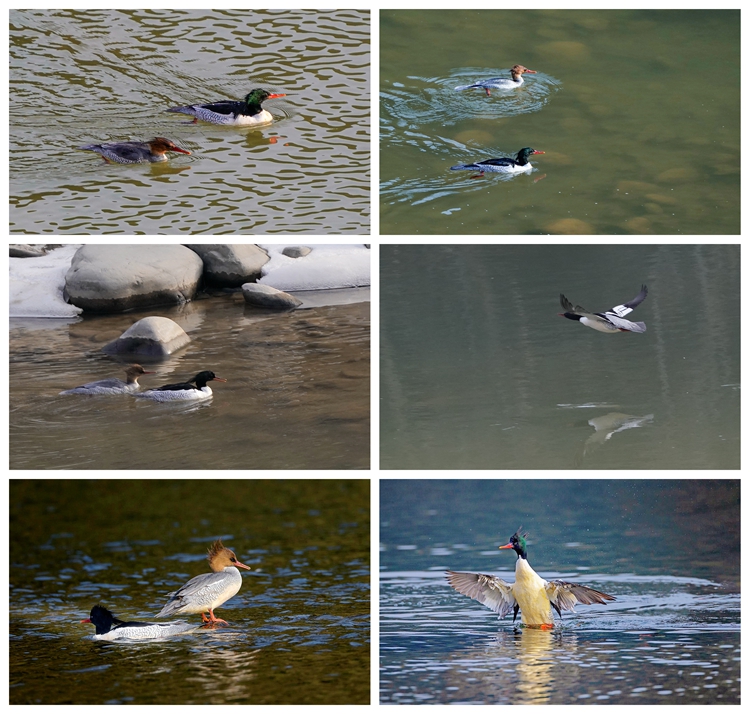 據張博介紹,12月10日,他在與山陽縣野生動物和天然林保護管理中心(以下簡稱“天保中心”)工作人員合作開展河流、濕地動物類群調查。在進行調查勘察路線時,發現2只中華秋沙鴨在水中慢游。張博立即從遠處開始拍攝,隨后越過層層緩坡,走到河邊抵近觀察拍攝。順流而下的中華秋沙鴨發現工作人員后反轉方向逆流而上,其余5只在工作人員剛下車時受到驚嚇馬上起飛,工作人員有幸拍到了照片。