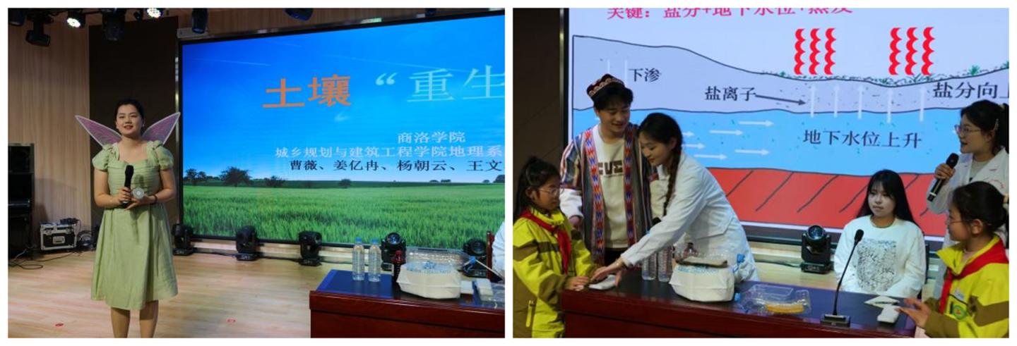 3月26日下午,在商洛市小學(xué)和商州區(qū)第六小學(xué),房舒博士帶領(lǐng)由曹薇、姜億冉、楊朝云、王文睿、高慶欣等地理科學(xué)專業(yè)學(xué)生組成的“土壤奇妙旅團(tuán)”,開(kāi)展了《土壤重生記》科普情景劇活動(dòng)。活動(dòng)以新疆農(nóng)民買買提改良鹽堿地的案例為背景,通過(guò)情景劇的形式生動(dòng)展現(xiàn)了土壤科學(xué)家如何幫助農(nóng)民改善土地質(zhì)量。團(tuán)隊(duì)設(shè)計(jì)了物理方法、化學(xué)方法和生物方法三種土壤改良技術(shù)的實(shí)驗(yàn)演示,讓學(xué)生們直觀了解土壤改良的科學(xué)原理。活動(dòng)過(guò)程中,團(tuán)隊(duì)成員與小學(xué)生積極互動(dòng),通過(guò)問(wèn)答和實(shí)驗(yàn)操作,深入淺出地講解了土壤保護(hù)的重要性。這種“實(shí)驗(yàn)+話劇”的創(chuàng)新教學(xué)模式,有效激發(fā)了學(xué)生們對(duì)地理科學(xué)的興趣。
