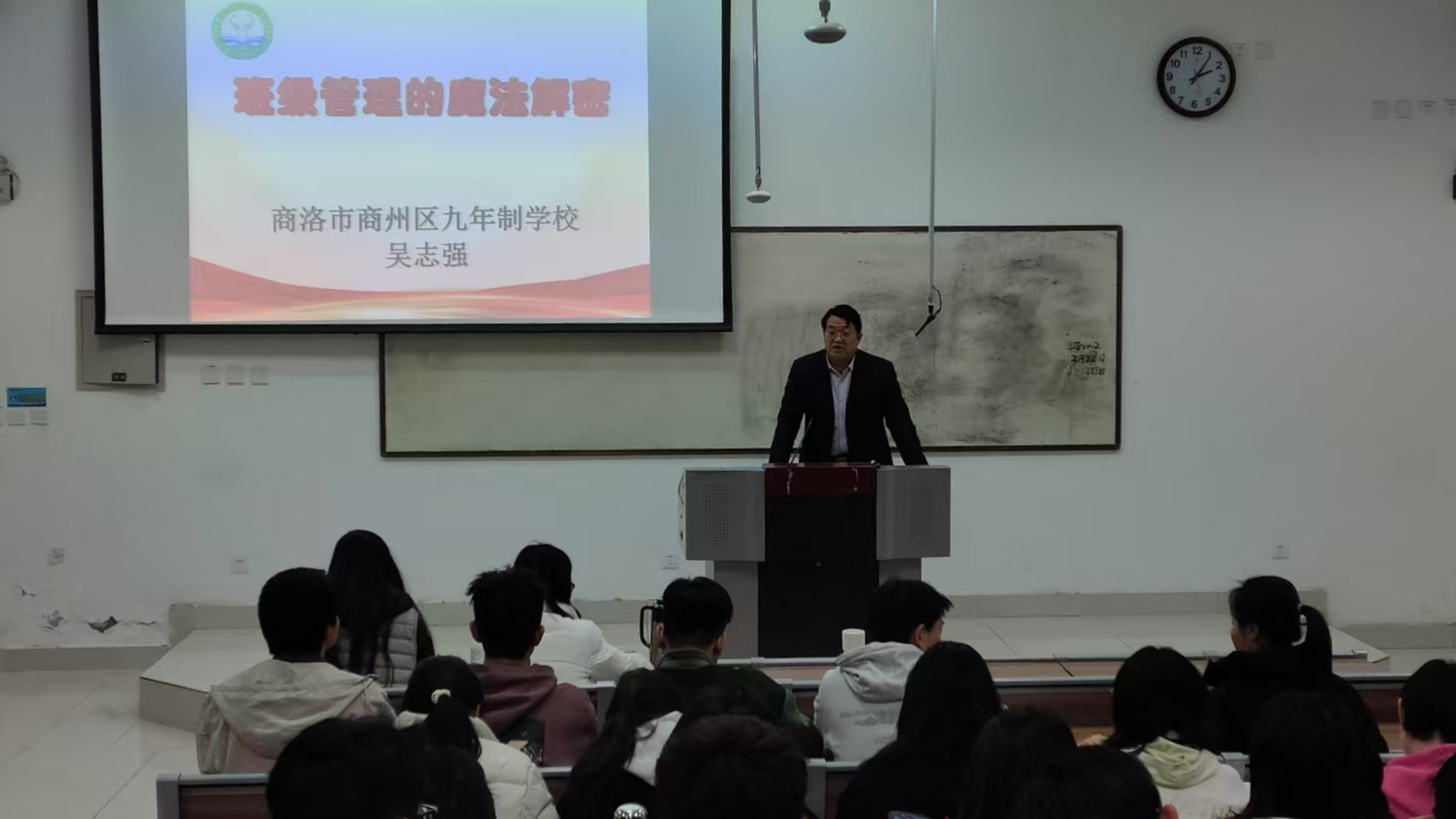 為提升地理科學(xué)專業(yè)師范生班級(jí)管理能力,不斷優(yōu)化“大學(xué)-政府-基礎(chǔ)教育學(xué)校”合作機(jī)制,3月27日,陜西省優(yōu)秀班主任、商州區(qū)九年制學(xué)校副校長(zhǎng)吳志強(qiáng)走進(jìn)課堂,為地理專業(yè)學(xué)生做了題為《班級(jí)管理的魔法解密》的專題報(bào)告。
