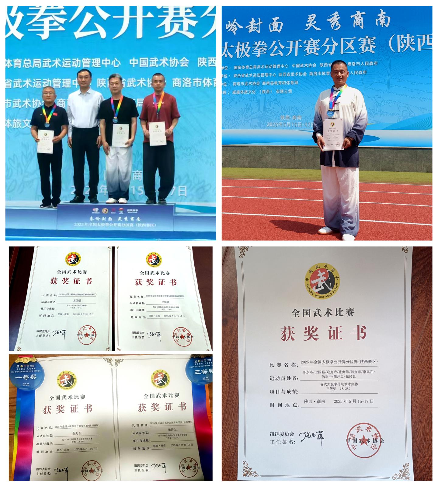 5月15日至17日,由國家體育總局武術(shù)運(yùn)動管理中心、中國武術(shù)協(xié)會、陜西省體育局、商洛市人民政府主辦,陜西省武術(shù)運(yùn)動管理中心、陜西省武術(shù)協(xié)會、商洛市體育局、商南縣人民政府承辦的2025年全國太極拳公開賽分區(qū)賽(陜西賽區(qū))在商南縣體育館舉行。我校教職工張丹生、衛(wèi)國強(qiáng)參賽并獲得個(gè)人項(xiàng)目一等獎2項(xiàng)、二等獎2項(xiàng)、三等獎1項(xiàng),集體項(xiàng)目三等獎1項(xiàng)。