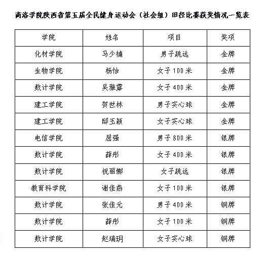 9月14日,陜西省第五屆全民健身運動會(社會組)田徑比賽在山陽縣落幕,在巔峰組比賽中,我校教師桑國鵬獲男子實心球第一名、王品獲男子跳遠第二名、閆蘇榮獲女子100米第二名,牛洋洋獲女子實心球第二名。比賽由體育教學研究部主任黃顯忠擔任領隊,王健、王品、桑國鵬擔任教練,帶領我校學生取得5項金獎、4項銀獎、3項銅獎的好成績,充分展現了學校體育育人的成果和學子們良好的精神風貌。